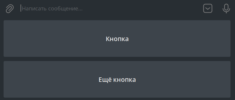 Unlike inline buttons, keyboard buttons are shown below the message input field (in web versions they can be accessed by clicking the command button ⌘). When pressing a keyboard button, the user simply sends its text.