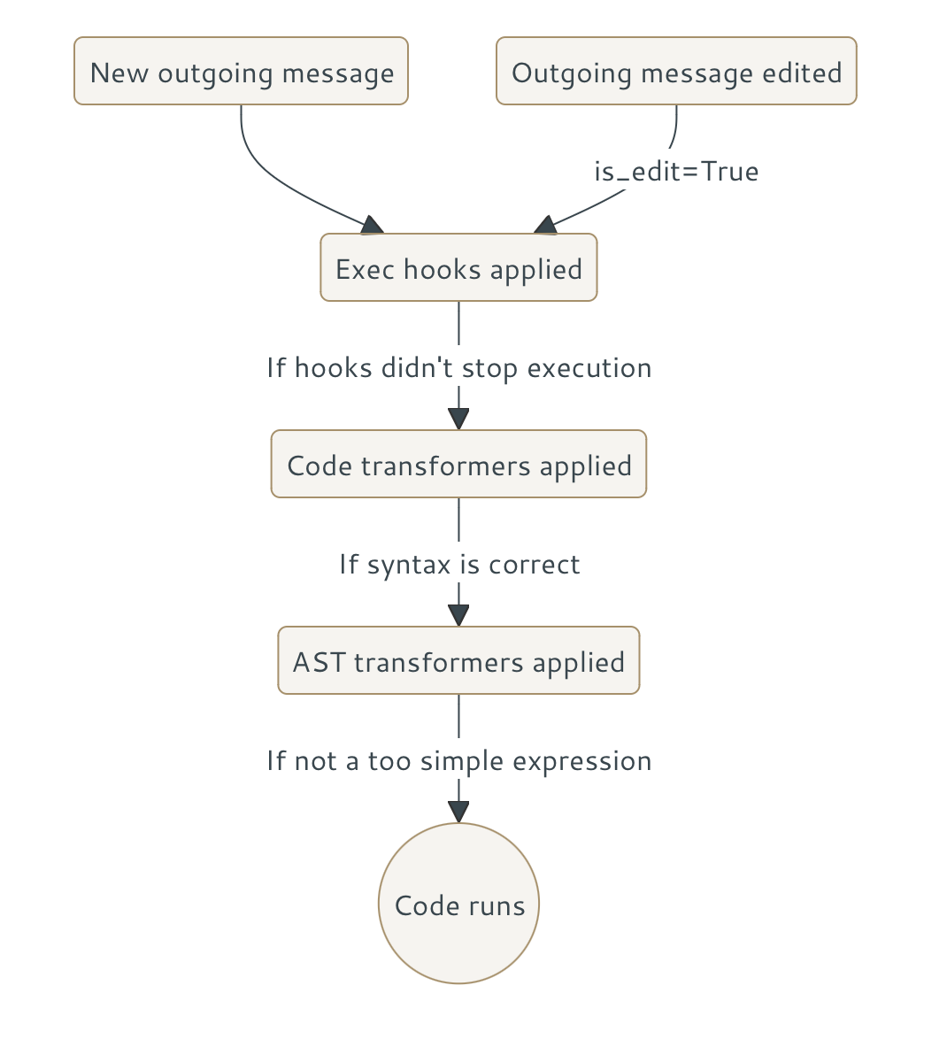 Exec hooks are functions that run before the message is parsed and handled. Unlike transformers, they may edit the message, delete it, and so on.